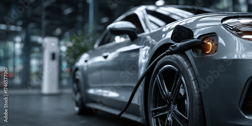 Electric car charging in modern station with sleek design and glowing connector