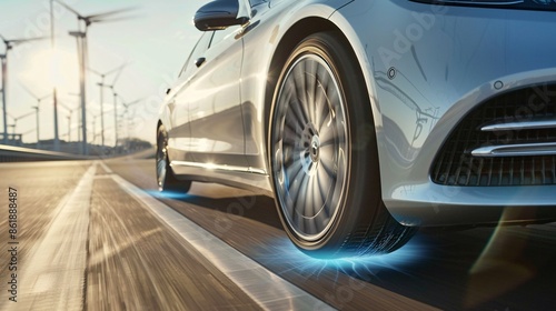 Electric Car Speeding Down the Road with Wind Turbines in the Background, Showcasing Sustainable Automotive Technology and Innovation, Generative AI