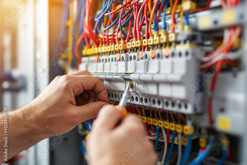Electrician's hands fixing a circuit breaker panel, colorful cables organized, realistic photo style, blurred interior background, concept of industry and technology. Ai generative