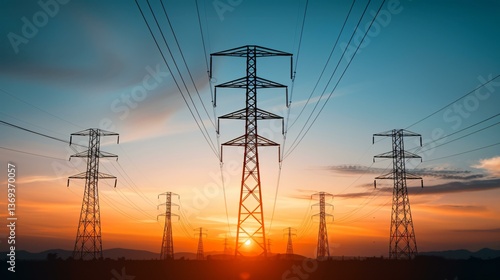 Electricity pylons and substation silhouetted against a vibrant sunset, energy transmission aesthetics