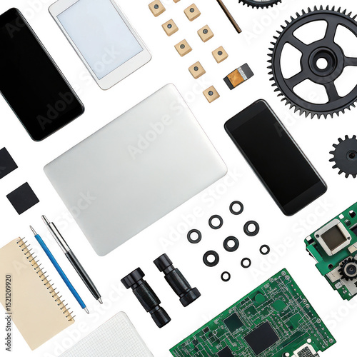 Electronic components isolated on transparent background for engineering and technology use