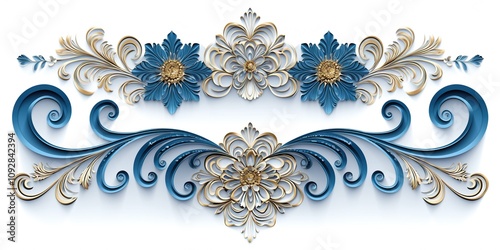 Elegant 3D Blue and White Flower Decorations with Gold Accents – High-Resolution Digital Art Featuring Smooth Patterns and Detailed Vector Illustrations on a Pure White Background