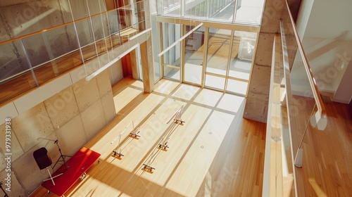 Elegant Aerial View of a Dance Studio with Polished Wooden Floor and Ballet Barre, Embracing the Essence of Artistic Expression and Performance Space