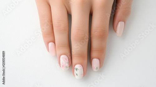 Elegant and Artistic Floral Nail Art with Soft Pink Base Color on a Woman's Hand Displayed on a White Background for Beauty and Fashion Inspiration