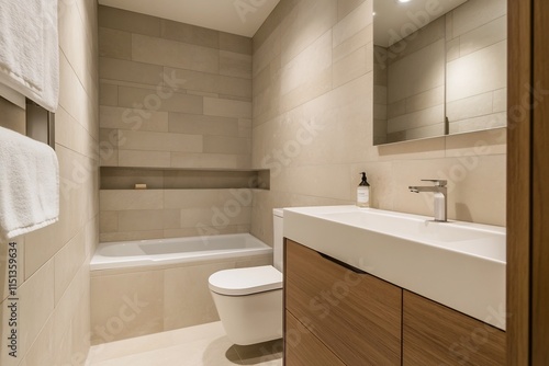 Elegant and Compact Bathroom Design with Matte White Fixtures and Wooden Vanity