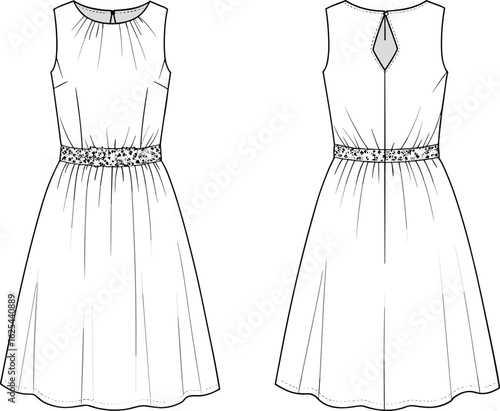 Elegant and festive sleeveless women's dress with embellished waistband and keyhole back for party and special occasions.