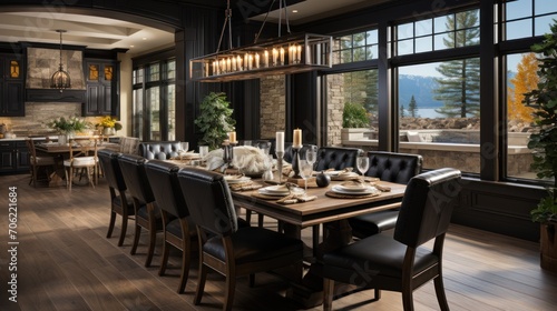 Elegant and large dining room with dark gray cupboards and walls, large windows and light