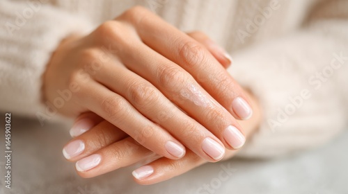 Elegant and Well-Groomed Hands with Soft Pink Nail Polish Resting on a Cozy Knitted Sweater in a Warm Indoor Setting