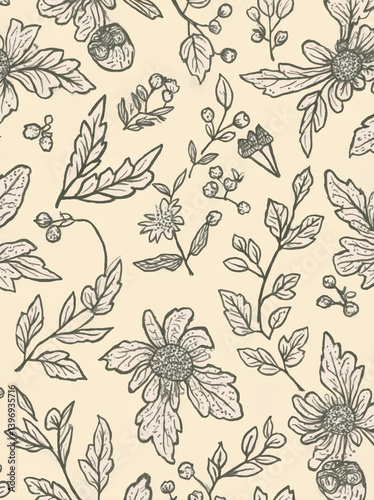 Elegant Beige Line Art Botanical Pattern, Generative AI