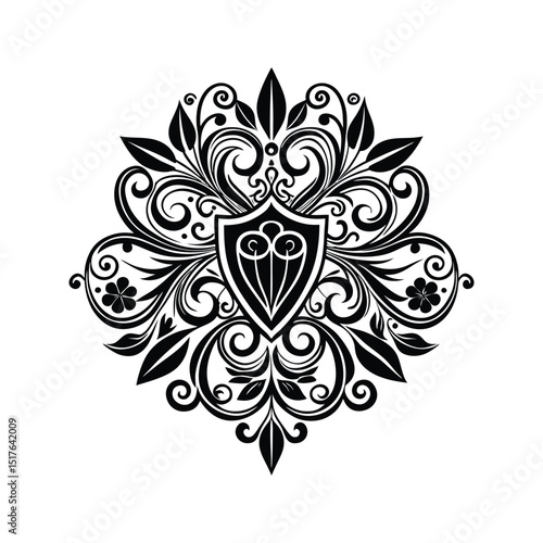 Elegant black and white floral crest design with decorative leaves and swirls ornament
