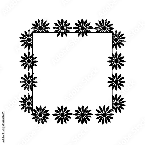Elegant black and white floral square frame with decorative daisy-like flowers arranged in a minimalist border, perfect for invitations, stationery, or design elements.