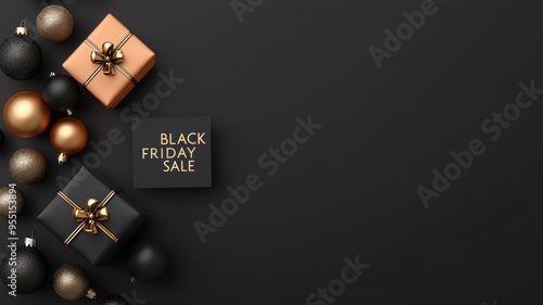 Elegant black Friday sale composition with stylish gifts and festive decorations on a sleek black background.