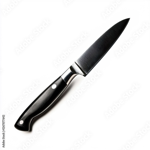 Elegant Black Kitchen Knife with Silver Accents on White Background, Kitchenware concept.
