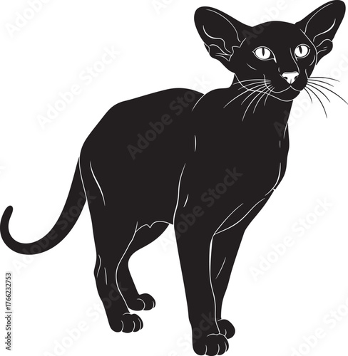 Elegant black siamese cat silhouette with large ears standing gracefully and looking alertly
