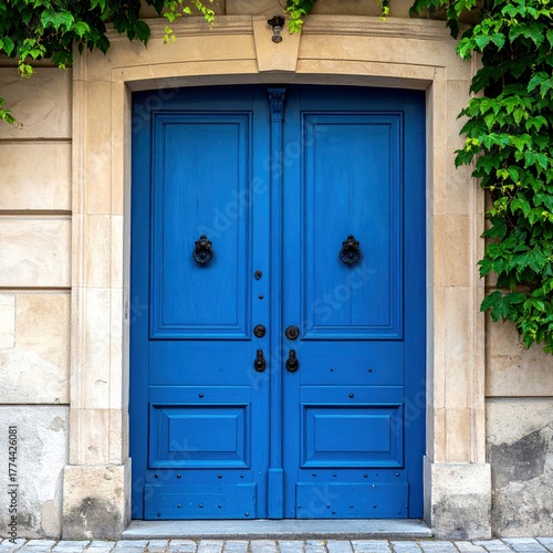 Elegant Blue Doors - A Parisian Architectural Detail with Ivy.