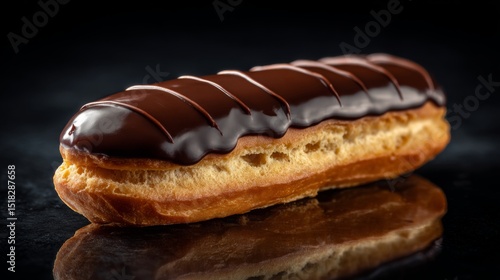 Elegant Chocolate Éclair with Glossy Glaze and Decorative Stripes – French Pastry on Dark Surface