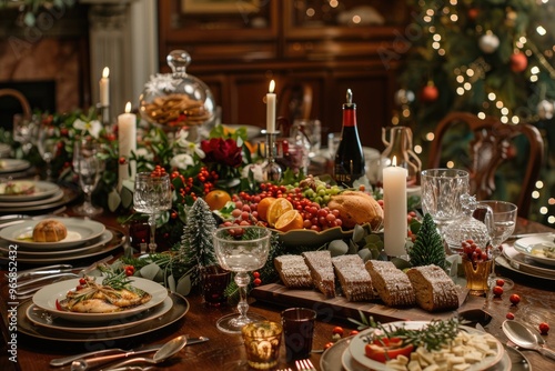 Elegant Christmas Dinner Table Setting with Candles and Festive Decor in Warm Lighting