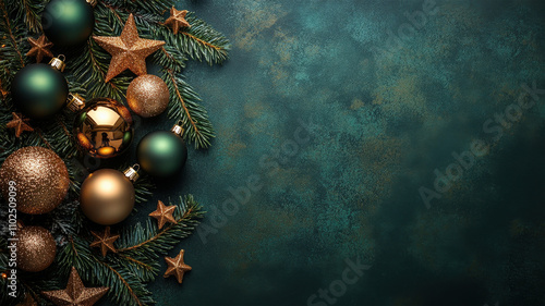 Elegant Christmas flat lay with gold and green ornaments, stars, and evergreen branches on a textured emerald background. Ideal for holiday cards, seasonal branding, and festive decorations