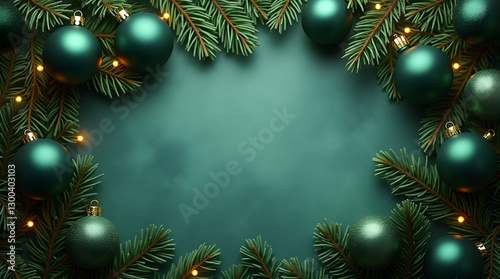 Elegant Christmas Holiday Green Ornaments Pine Branches Warm Lights Frame Dark Teal Festive Background Design for Christmas Holiday Cards and Greetings