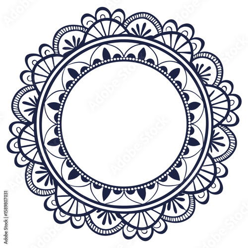 Elegant circular decorative design featuring intricate patterns and lines in a detailed and stylish dark blue tone on a white background