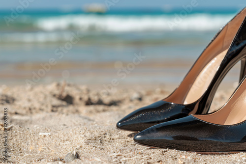 Elegant classic black high heel shoes on sea ocean beach. Quiet vacationing, hidden vacation, holiday, stealth vacation, workcation, remote working, employee burnout, secret getaway, work life balance