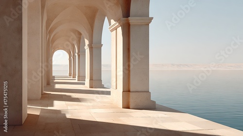 Elegant classical architecture featuring arched colonnades with columns and scenic outdoor corridor illuminated by sunlight and shadow showcasing timeless design