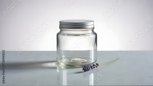 Elegant clear glass jar with metallic lid and single lavender sprig resting on a reflective marble surface, offering a serene and natural aesthetic for wellness or home decor concepts