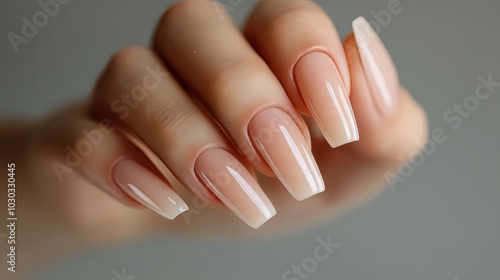 Elegant close up of woman s hands showcasing neutral gel polish manicure on square nails