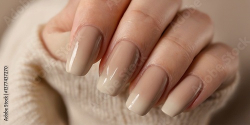 Elegant closeup of person's hand with long, pointed nails painted in light beige with glossy finish and intricate design.