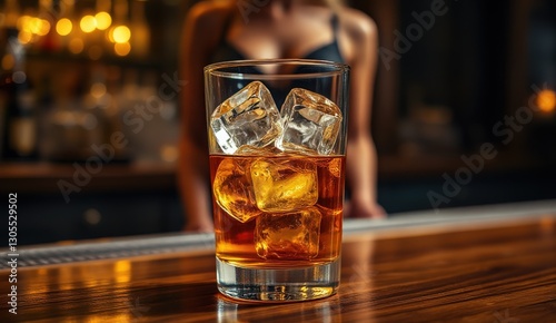 Elegant Cocktail Glass with Ice in Trendy Bar Setting at Night