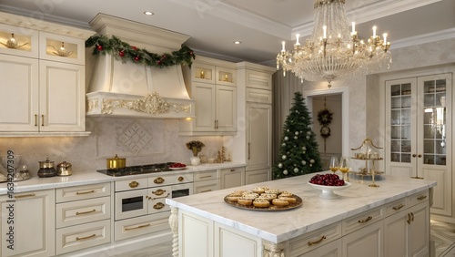 Elegant Cream Kitchen with Gold Holiday Garland and Festive Pastries