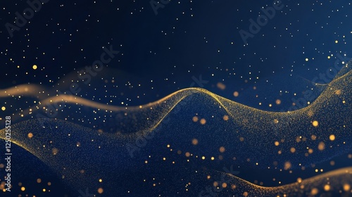 Elegant Dark Blue Background with Golden Sparkling Particles and Wavy Lines for Luxury and Festive Designs.