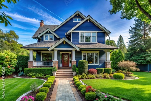 Elegant Dark Blue Craftsman House with Architectural Details Surrounded by Lush Green Landscaping