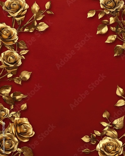 Elegant decorative frame featuring golden roses on a rich red backdrop