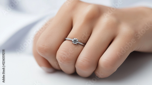 Elegant diamond engagement ring on woman's hand, romantic proposal