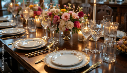 Elegant Dining Table Setting with Floral Centerpiece and Candlelight