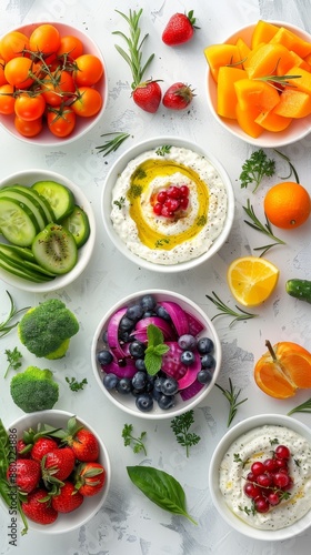 Elegant display of assorted fruit salads and vegetable dips on a pristine white background