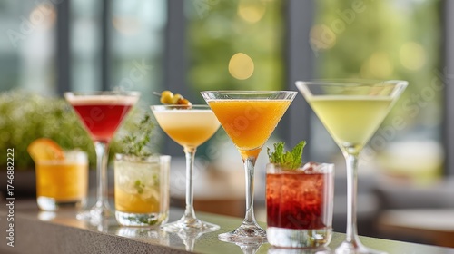 Elegant Display of Colorful Cocktails with Fresh Garnishes at a Modern Bar Setting