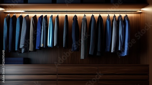 Elegant display of various suits hanging in a modern wardrobe, showcasing stylish fashion choices