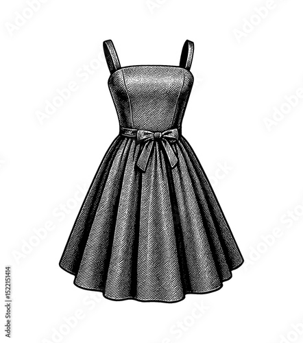 Elegant Dress with Bow Detailed Engraved Illustration of a Dress in Retro Style