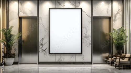 Elegant Elevator Lobby with Blank Poster Mockup, Stainless Steel Doors, Marble Wall and Green Plants in Modern Interior Design Aesthetic