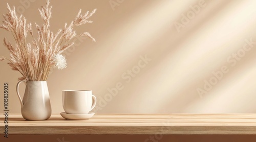 Elegant empty wooden tabletop counter with a gradient background, designed for product mockups in a minimalist style, providing ample copy space and a sophisticated ambiance.