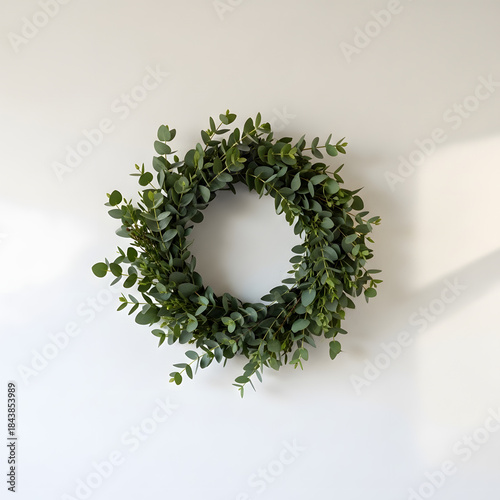 Elegant eucalyptus wreath adorning a minimalist white wall with subtle natural light
