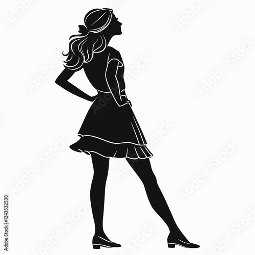 Elegant Fashionable Woman in a Bold Stance with Flowing Hair and Stylish Dress in white background