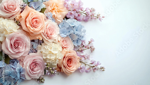 Elegant floral arrangement featuring roses and hydrangeas, ideal for Mother's Day, weddings, or romantic events. Perfect for design use in celebrations.