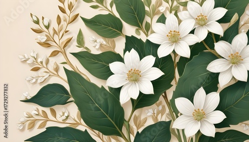 Elegant floral arrangement featuring white flowers and lush green leaves.