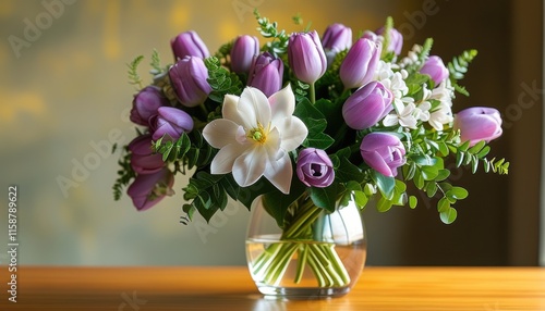 Elegant floral arrangement with purple tulips and white lilies in glass vase