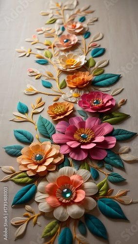 Elegant floral arrangement with textured paper flowers and jewel accents artwork