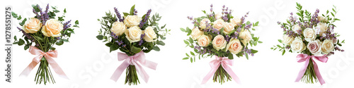 Elegant floral bouquet arrangement in soft color palette with white roses lavender sprigs greenery and ribbon Beautiful romantic wedding or event centerpiece