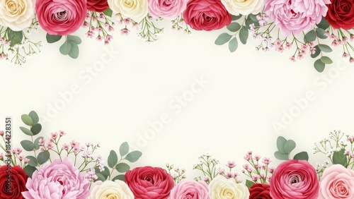 Elegant Floral Frame with Colorful Roses and Green Leaves on a Light Background.
